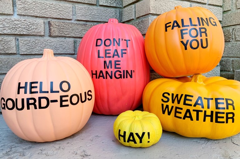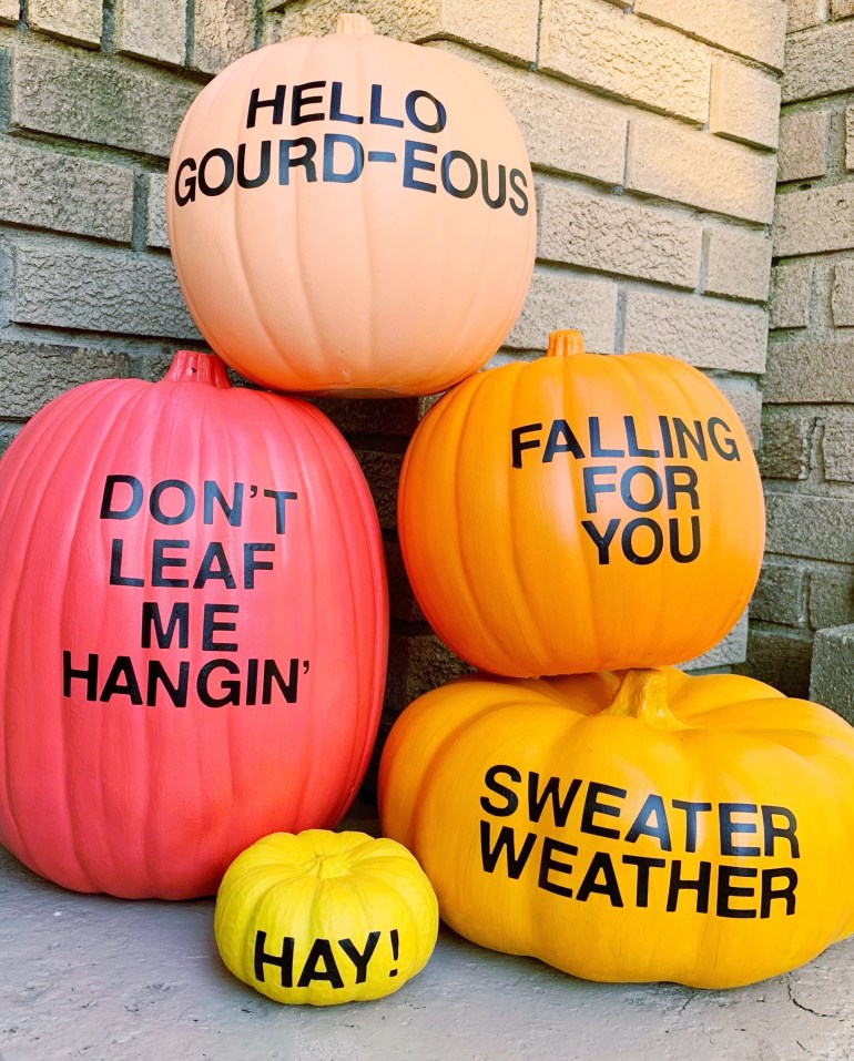 These Autumn PUN-kins are inspired by Studio DIY’s Halloween pumpkins she made a few years ago! I saw them on her page and just couldn’t resist doing my own! But I decided to add a little twist on her version, and come up with some new puns to display! Who’s in?!