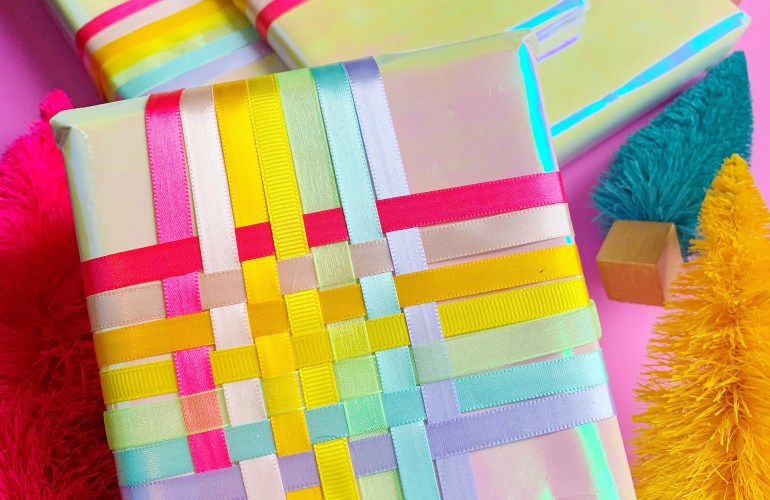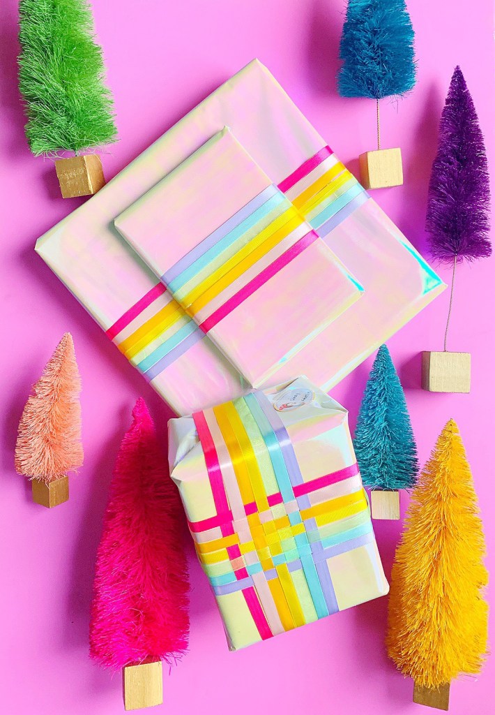 - Wrap each ribbon (one at a time) around the gift and secure with tape.