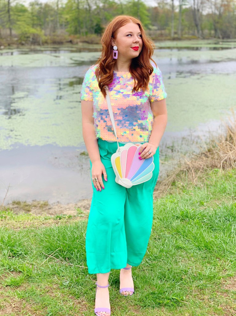As for this Disneybound, I chose to resemble Ariel! Am I wearing a fin? No. But my pants are a similar color to her fin! Am I wearing a seashell bra? Nope! But I do have a seashell bag! It’s all about taking inspiration from the character and recreating their look in a “non-obvious” way!