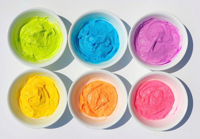 2.) After colors have been mixed in completely, take each color and place into a large bowl all together. If you want to make yours look just like mine, place the colors around side by side in a color wheel.