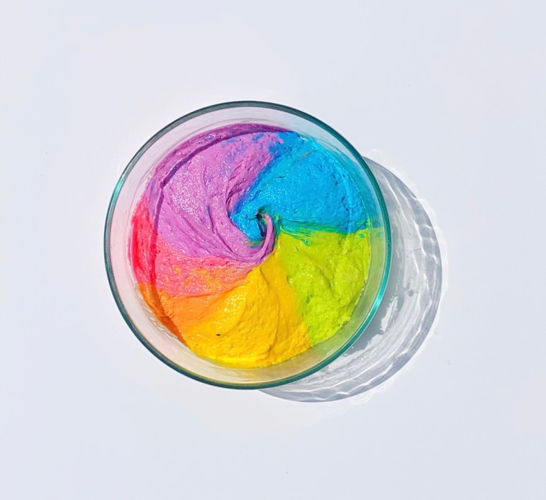 3.) Level and smooth each color gently together and using a knife or icing spatula spiral the colors together in the middle. Mix the colors together as much as you like! Just be advised if they are mixed together too much, the colors will combine and form a brown color-yuck!