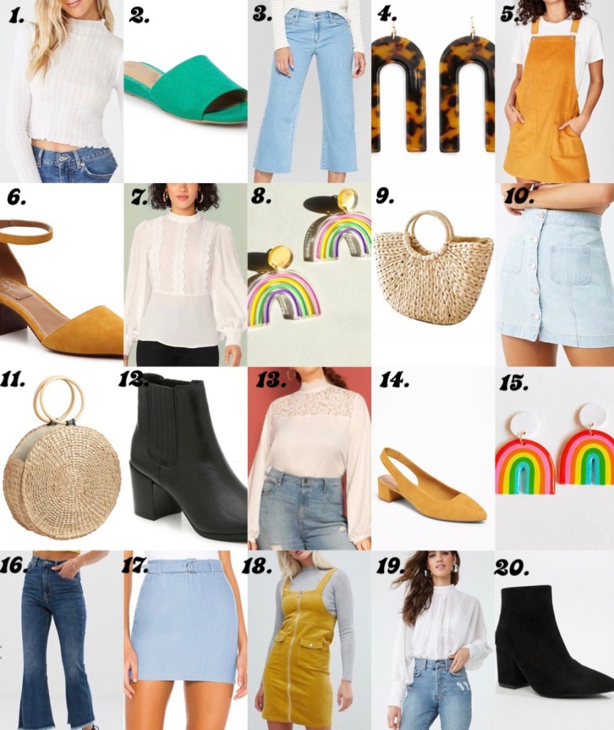 Original clothing sources: Top – Charlotte Russe / Jeans – H&M / Skirt – Charlotte Russe / Pinafore Dress – ASOS / Yellow Shoes – Forever21 / Black Booties – Charlotte Russe / Green Shoes – Primark / Arch Earrings – Forever21 / Panama Hat – Forever21 / Rainbow Earrings – Blush Daisy / Purse – Forever21