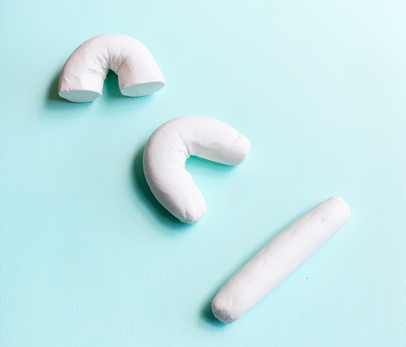 1.) Knead and mold the clay into desired shape. For this rainbow, I rolled out the clay into a thick “rope” and bent it into an arch. Make sure the bottom is completely flat so that it has a stable surface to sit up on.
