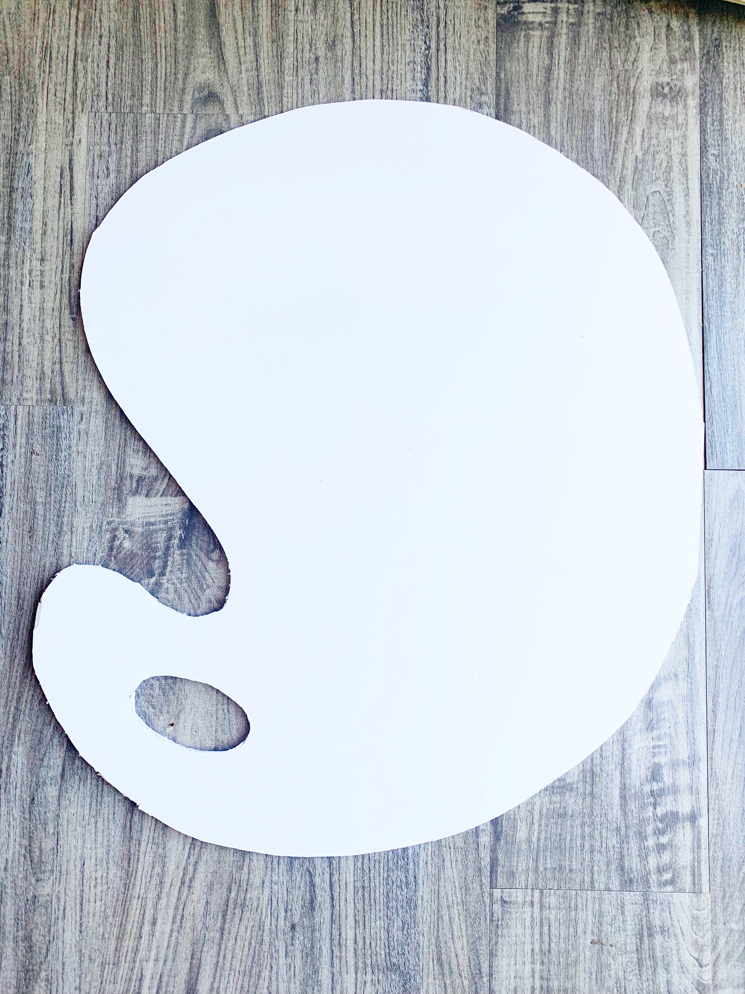 1.) Cut out an oval shape from your foam board. Once circle is cut, cut out sections of the oval for you to grab the palette by. This means to cut out a rounded notch on the side and a hole right below it. (use my images as reference for the shape)
