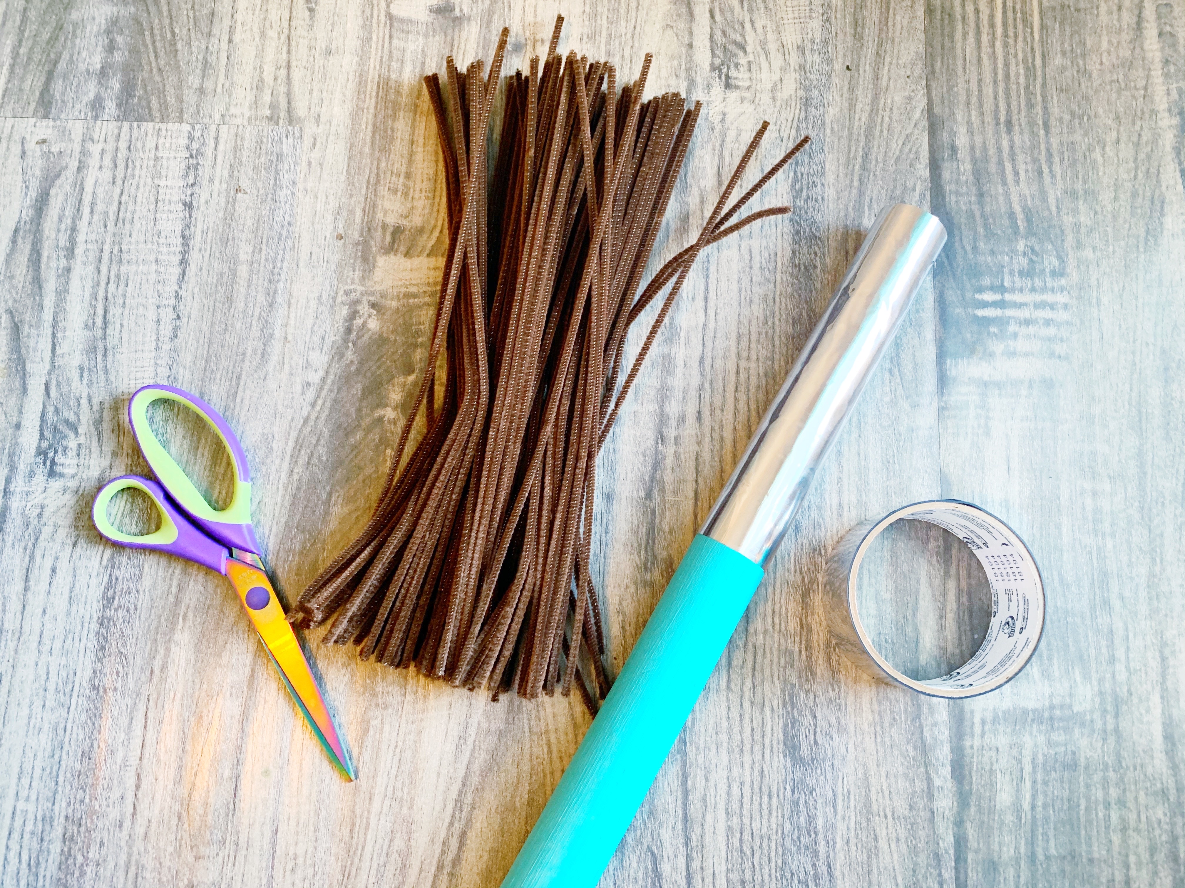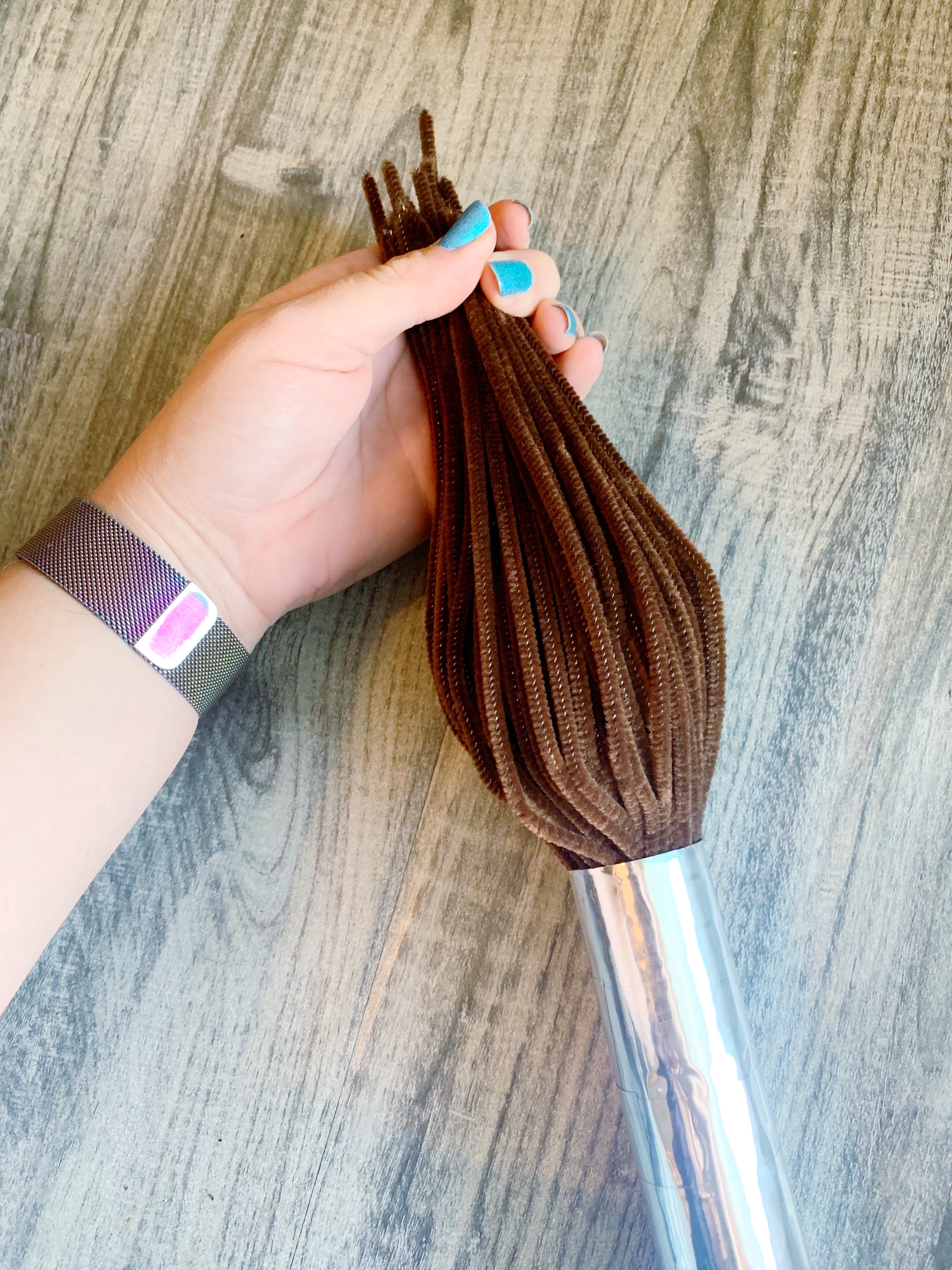3.) Bunch together all your pipe cleaners and stick it through the opening of the tube on the side that you put the silver tape on. Use hot glue gun to permanently affix the pipe cleaners onto the inside of the tube.