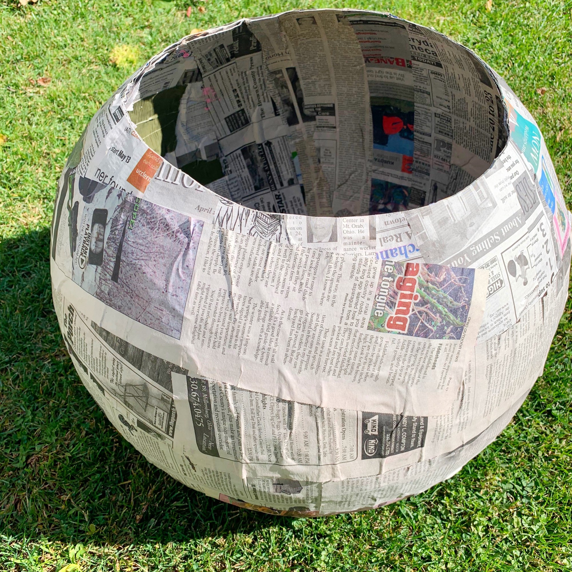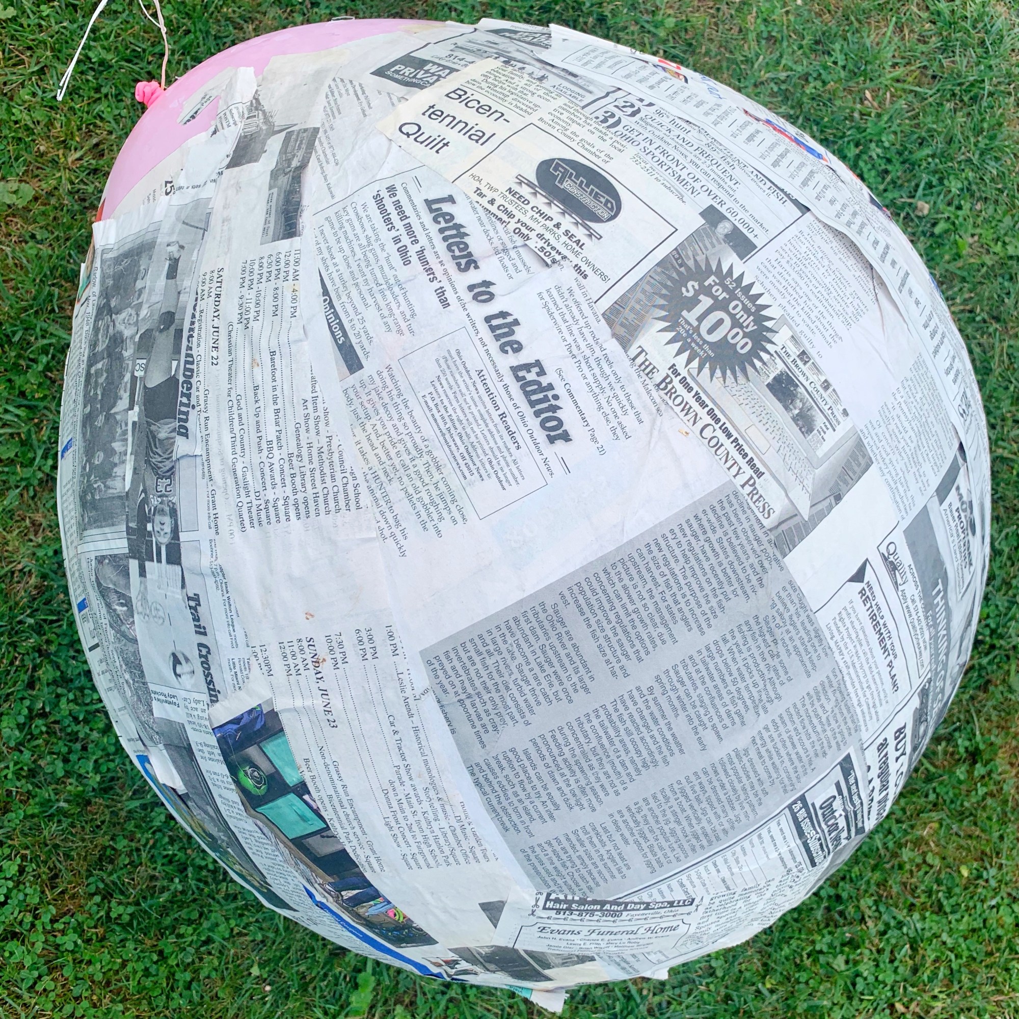 3.) Once all your layers have been completed and the newspaper is completely dry, its time to remove the balloon. Cut a hole in the balloon and deflate slowly. Make sure to remove all access pieces of balloon inside the ball.