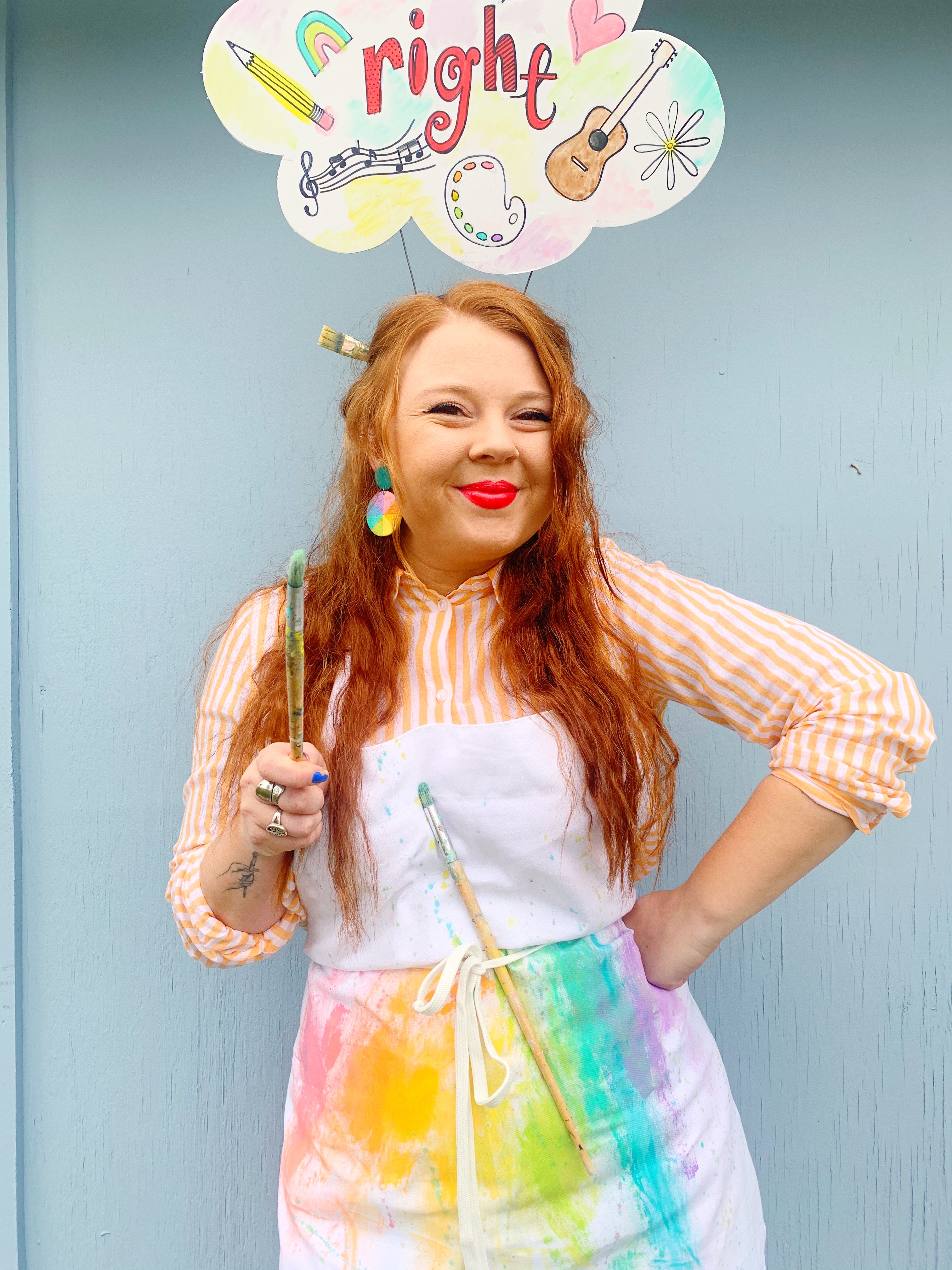 For my right-brain costume, I tried to channel my inner Miss Frizzle! I mixed bright, colorful patterns and made my whole look a little “messy” to imply a scattered brain. In my bubble I included music, art and all things creative and imaginative.