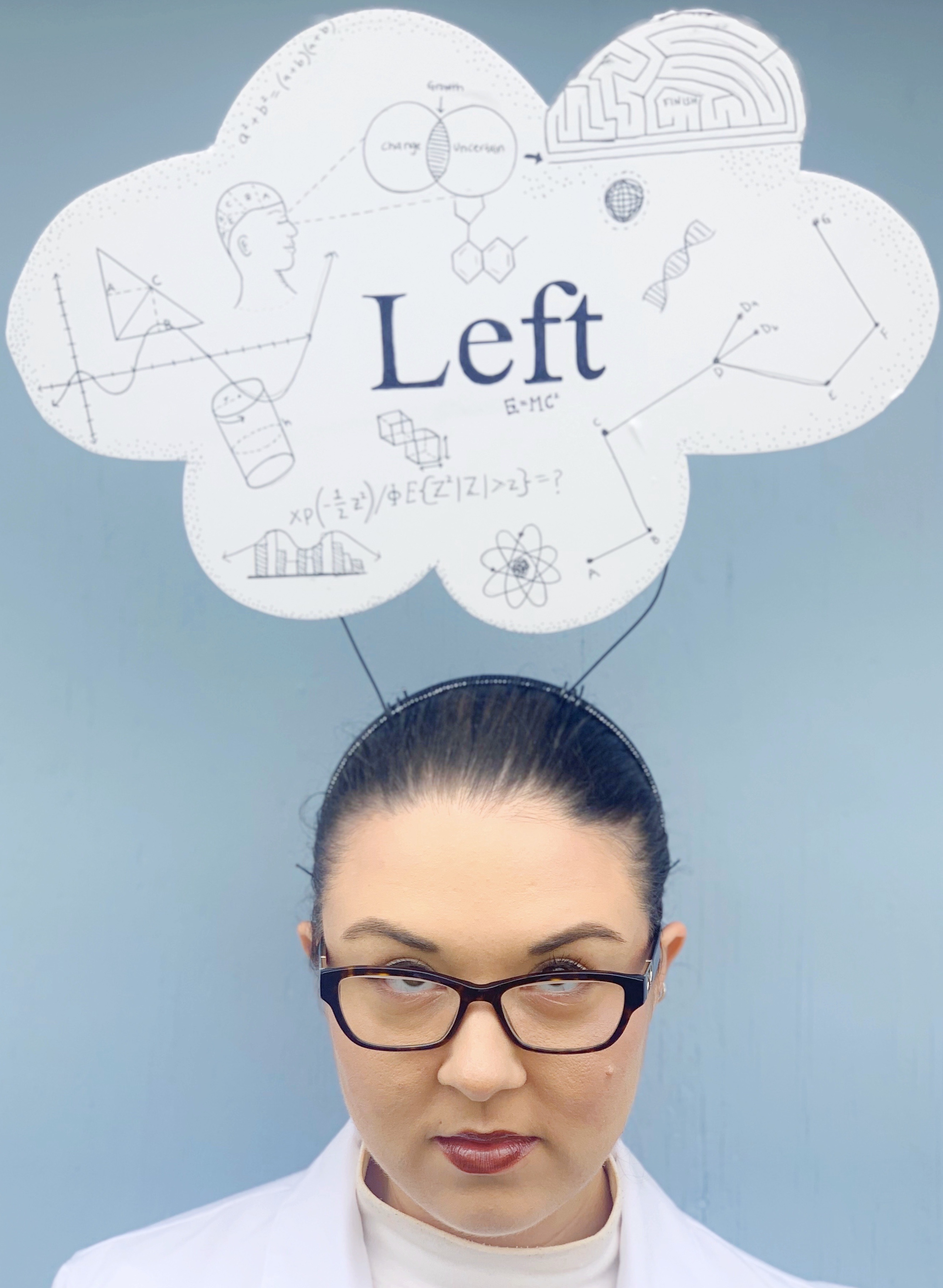 For her outfit I wanted to focus on typical left-brain occupations and thinking! So, I got her a lab coat and had her dressed in simple white clothes. In her thought bubble, she has lots of equations, measurements and all things to do with logic and linear thinking.