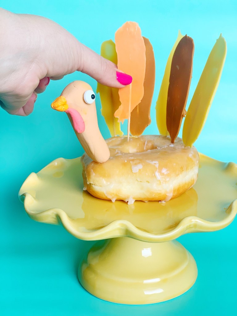 4.) Now it’s the fun part! (especially for the young ones!) It is time to decorate your donut! Pick out your favorite donut and poke the turkey head on one side of the donut, and poke the feathers through the opposite side. Put as many feathers as your heart desires!