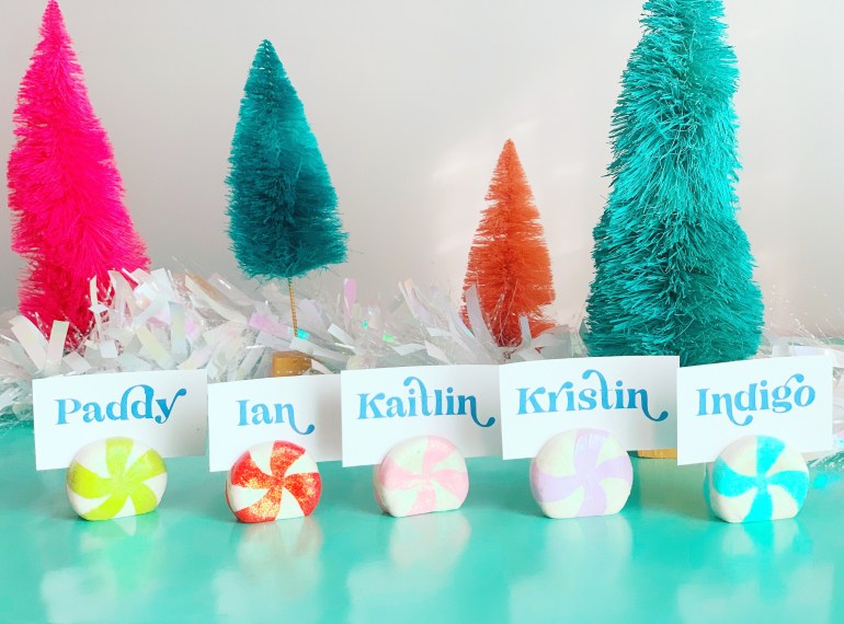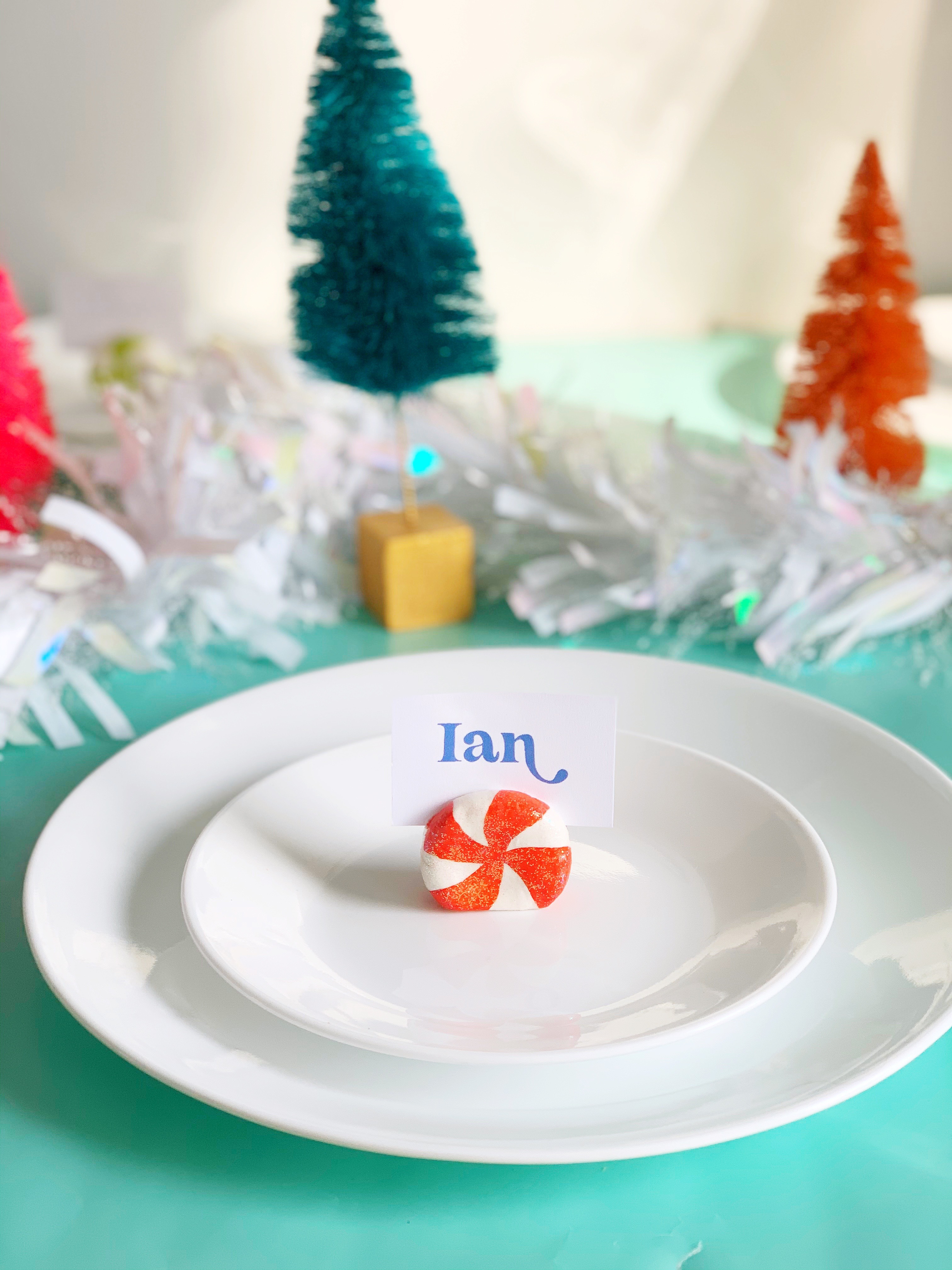 The most wonderful time of the year is almost here! So that means it’s time to start planning out all our favorite Christmas festivities! For some of you, Christmas dinner may be one of your most favorite family traditions. And these cute little peppermint place card holders are the perfect addition to that! They will help jazz up the table and add a little bit of quirky, colorful, winter wonderland-vibes to your Christmas dinner!
