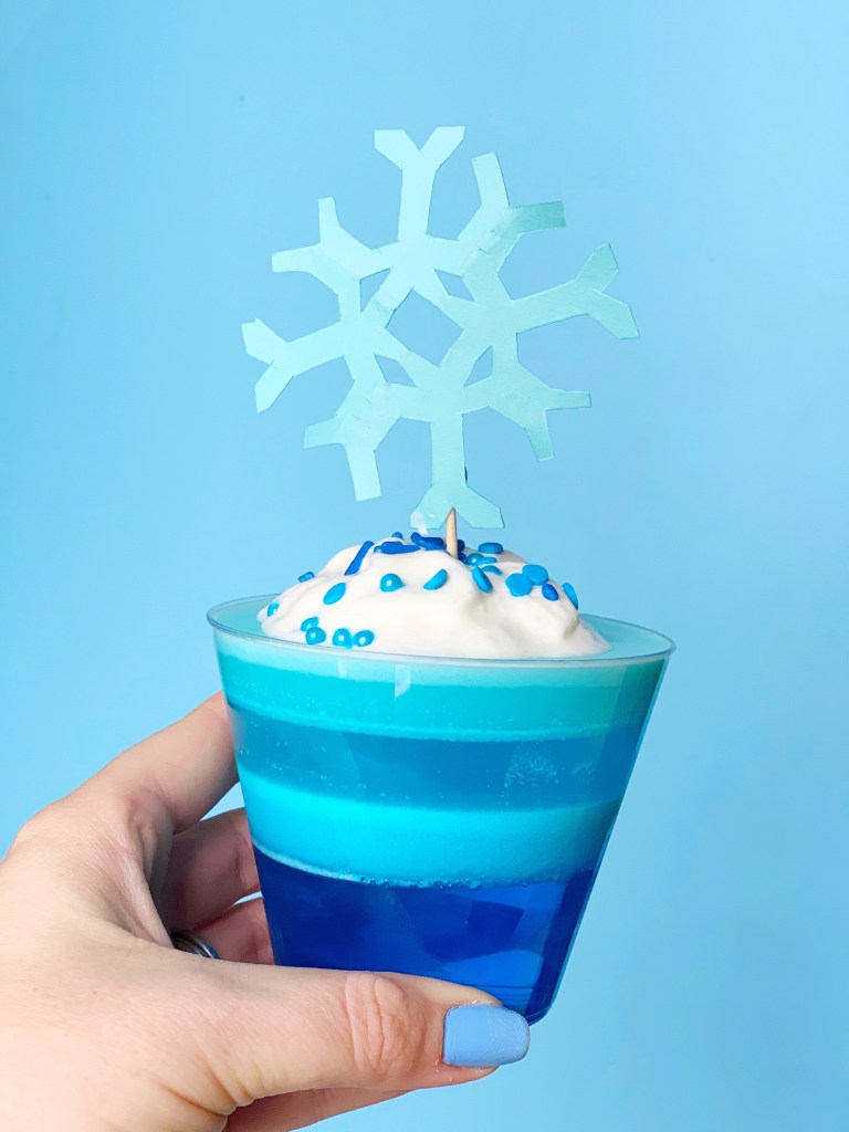 1.) Now that your jell-o mixture is fully solidified in your cup, it’s time to make the decorations! You can either print out a picture of a snowflake onto a piece of card-stock paper or you can cut your own out of light blue colored construction paper.