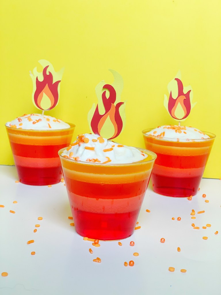 1.) Now that your jell-o mixture is fully solidified in your cup, it’s time to make the decorations! You can either print out a picture of flames onto a piece of card-stock paper or you can cut your own out of colored construction paper.
