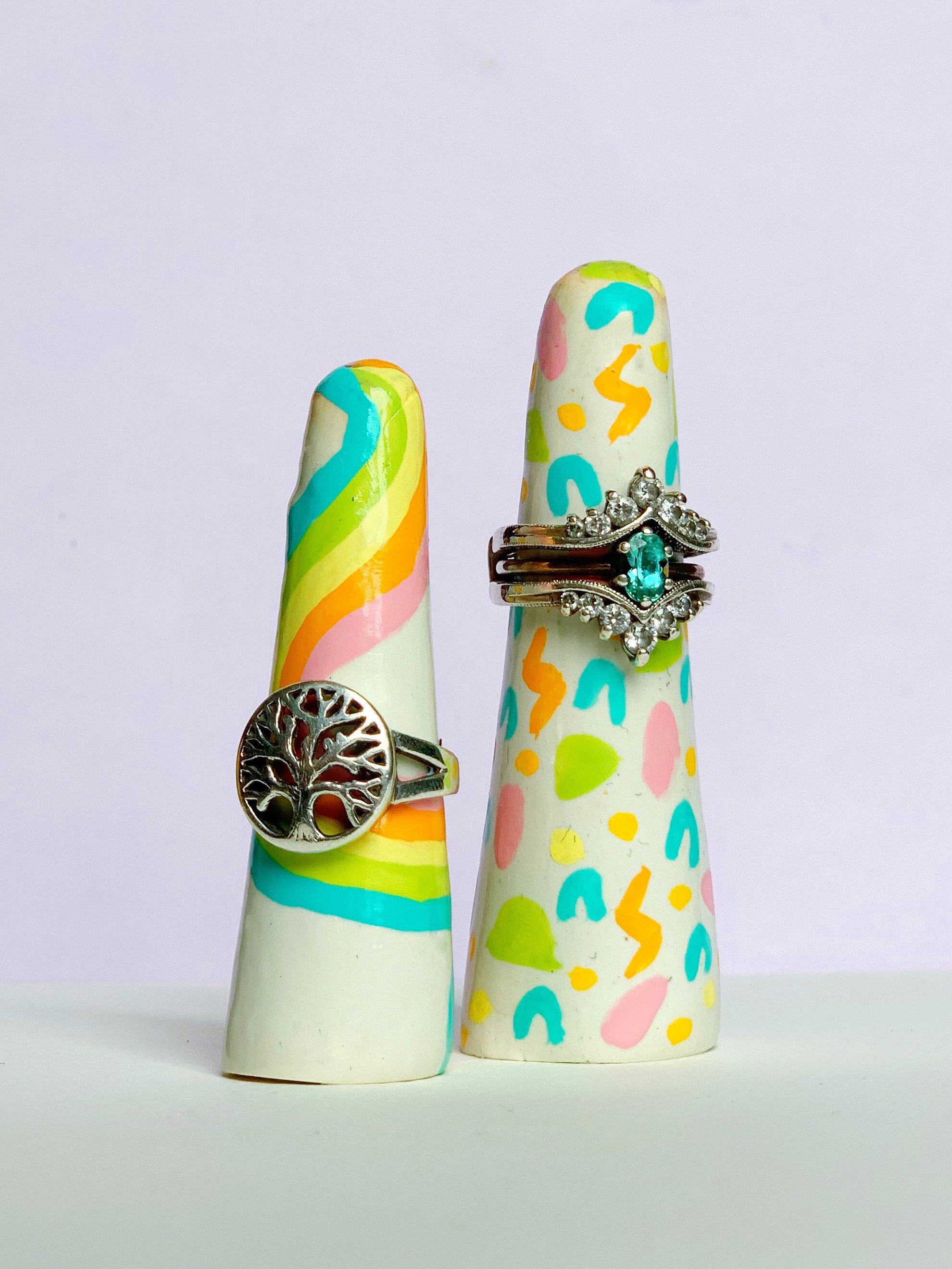 These are super cute and SO “you”! I could have seen just these photos with zero context and instantly picked that these were an Auburn Artisan creation ☺️🌈 I also love the fact that you made them yourself as they will actually fit YOUR rings! Every ring holder I’ve bought over the years has never fit my rings because my fingers are so tiny, as are my rings 😅 so I’m just going to make my own next time!