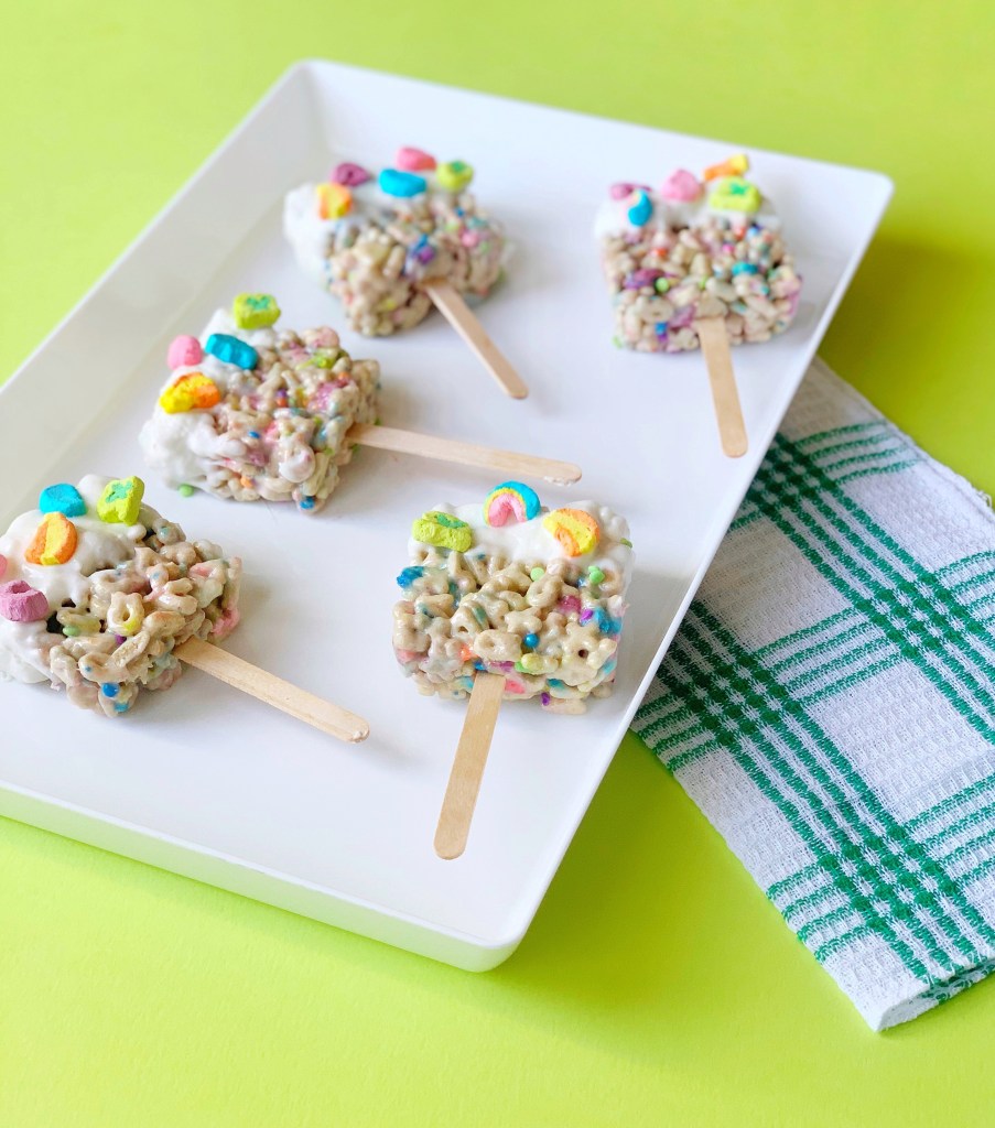 7.) Take your popsicle sticks and press them through the “bottom” of your Lucky Charms treats. Each treat will have one stick. Set aside.