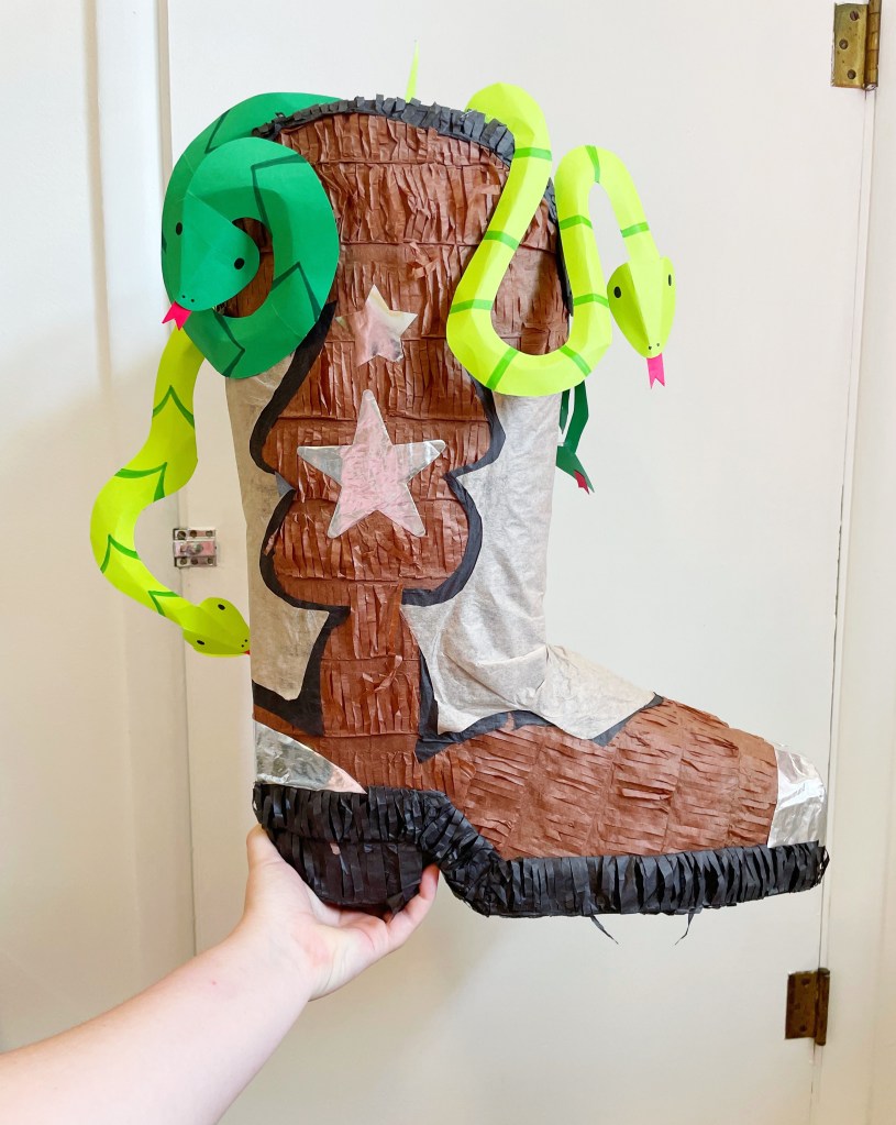 I was originally planning on making my own piñata from scratch for the kids to bust open (here are a few examples of piñatas I have made in the past: rainbow, watermelon) but when I was at Hobby Lobby one day I spotted this ADORABLE little cowboy boot piñata and just knew I had to get it!! It was perfectly on theme as-is, but I decided to go ahead and make my own little snakes to help finish the look! “I’VE GOT A SNAKE IN MY BOOT!“