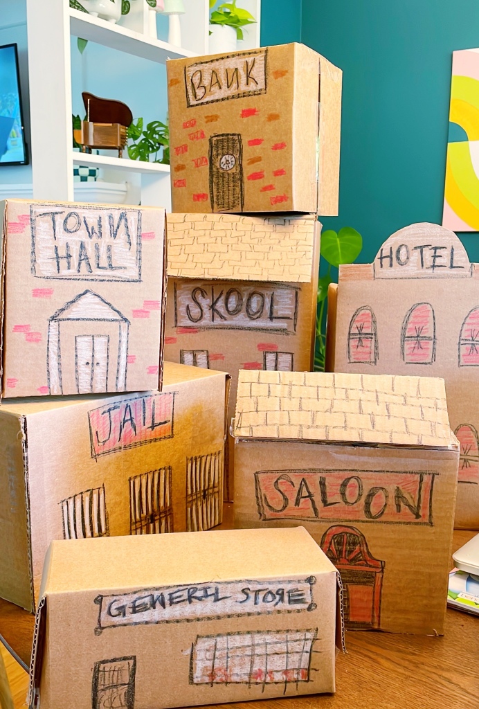 I constructed and decorated these cute little cardboard buildings to match the cardboard village that Andy was playing with in the first movie!