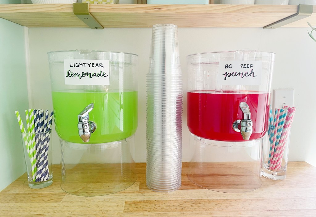 My husband and I sat down for a good 10 mins one night trying to come up with some punny/themed drinks to serve our guests… after heavily debating, we came up with “Lightyear Lemonade” (lemonade dyed green) and “Bo Peep Punch” (fruit punch)! haha
