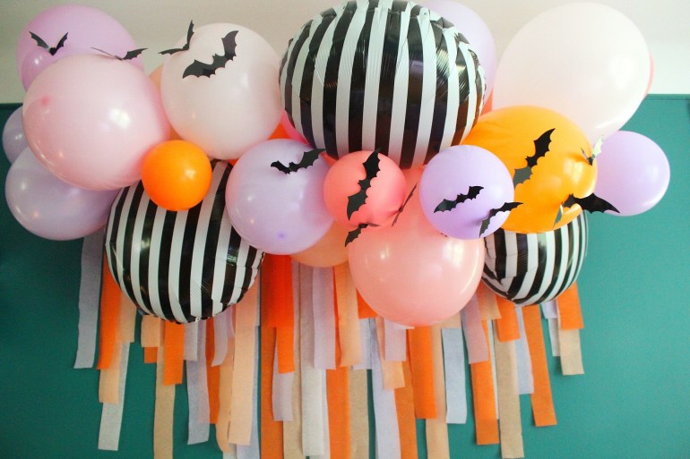 LINKS: Balloon Garland | Caldron Balloon | Bat Balloon | Striped Balloons | Cupcake Liners/Toppers | Ghost Table Cloth | Ghost Serving Bowls (from HomeGoods) | Book of Spells Plates | 3D Bats | Witch Costume | Pumpkin Costume
