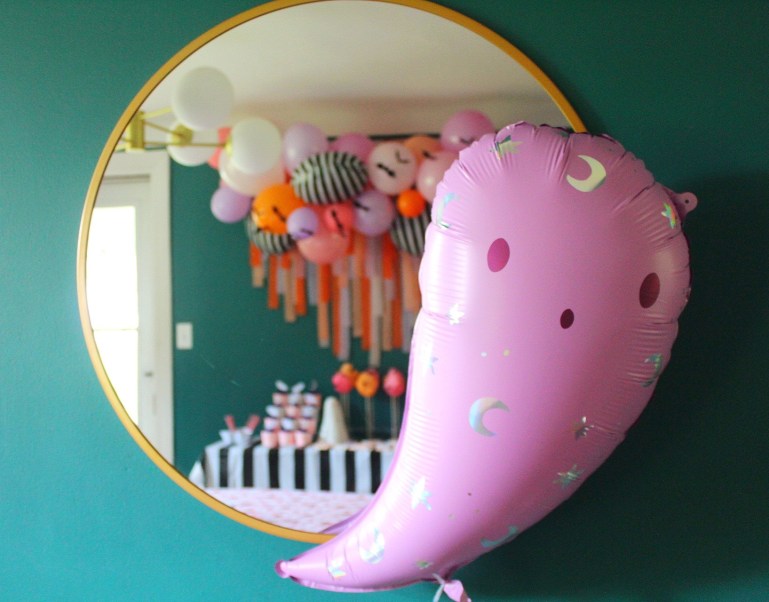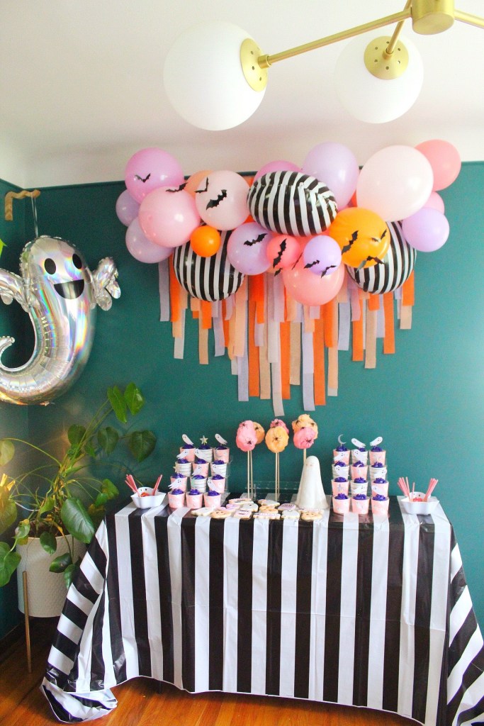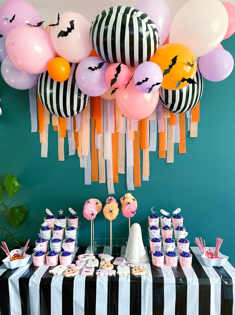 To say I was obsessed with the decor of this party would be an understatement! The colors, the patterns, the theme- I loved it all! I am a huge fan of pastel Halloween decorations (I’m more of a cutesy Halloween girl than a spooky/gory one) so that’s where most of my inspiration came from! I loved the pastel pinks, purples and oranges juxtaposed to the bold black and white stripes! So good!