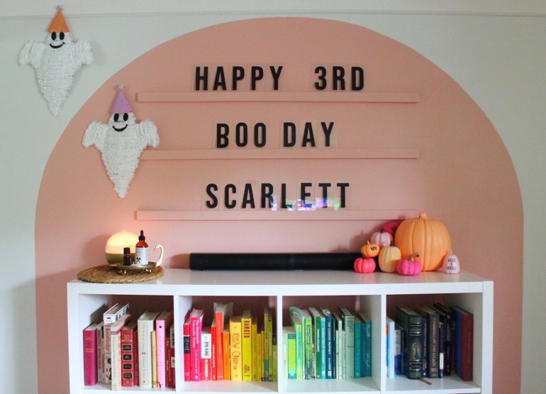 Scarlett is still at an age where she doesn’t quite understand what I mean when I ask what theme she wants for her birthday party, so it was left up to us to decide. I wanted to pick a theme that she would absolutely LOVE, and since Halloween is her favorite thing in the world, I knew it had to be that! This girl is a certified spooky-season queen! Anyone that knows Scarlett knows she is obsessed with ghosts, witches and pumpkins! She greets people by saying “Happy Halloween!” And all she wants to do is play dress up and eat candy all day- this party theme was a no brainer!