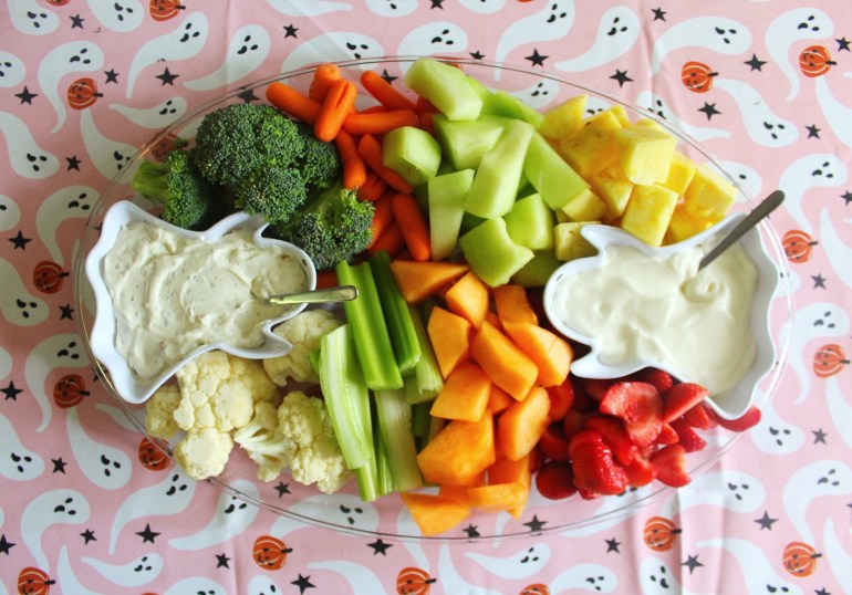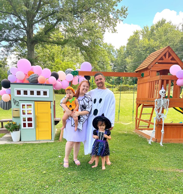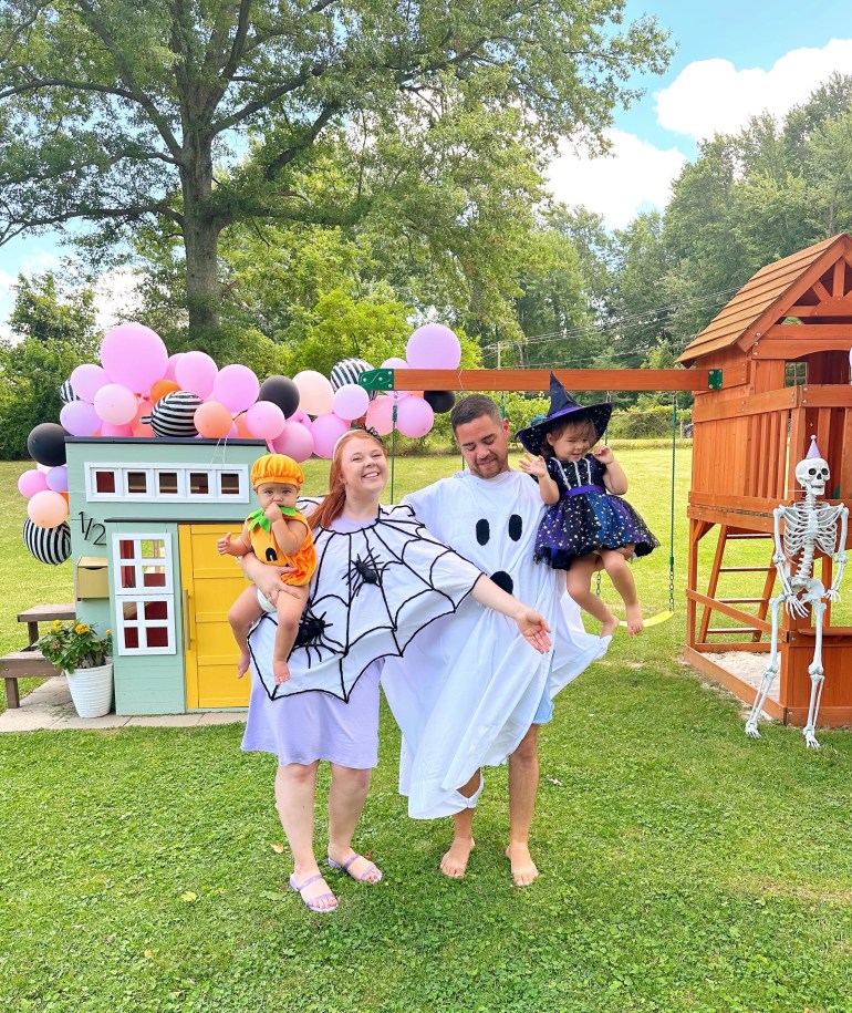 Not only did we want a Halloween themed party, we also wanted to dress up as if it were actually Halloween! As you should know by now, I LOVE making Halloween costumes (one of my favorite things to do each year!) but I typically make something more “out of the box”. For this party I wanted all of us to be quintessential “Halloween things”, so I kept it pretty simple! Scar has been begging to dress up as a witch, so of course we had to make that happen! And she kept insisting her sister needed to dress up like a pumpkin, so we made that happen too! Both of their costumes were store bought, but Ian and I decided to make our own costumes! He was a ghost and I was a spider web lady! haha