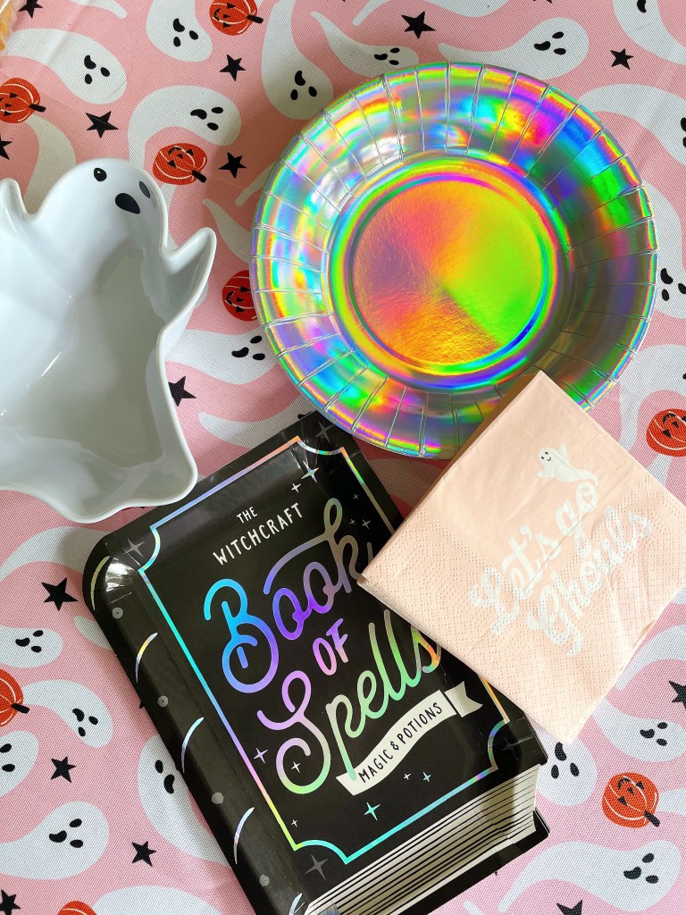 I found some of THE CUTEST accessories for this party! Like this witchcraft book plate and these “let’s go ghouls” napkins! I ended up buying a ton of reusable materials as well, like those little ghost serving bowls and this adorable ghost tablecloth! We actually host a Halloween costume party at our house every year, so a perk of purchasing all the re-usable decor and party supplies is I can use it again for those parties!