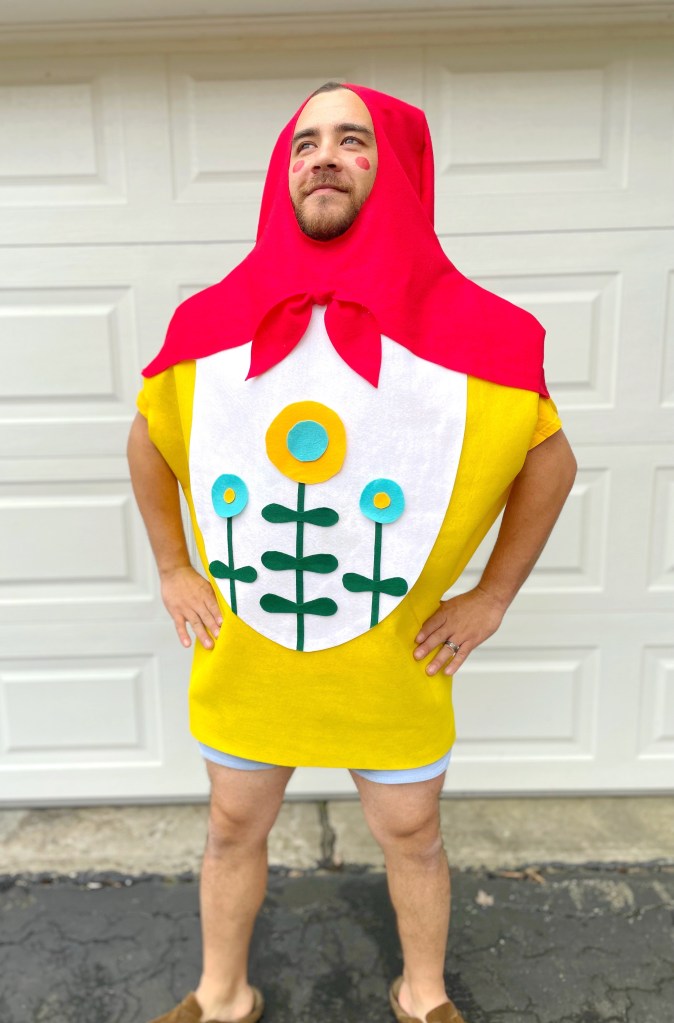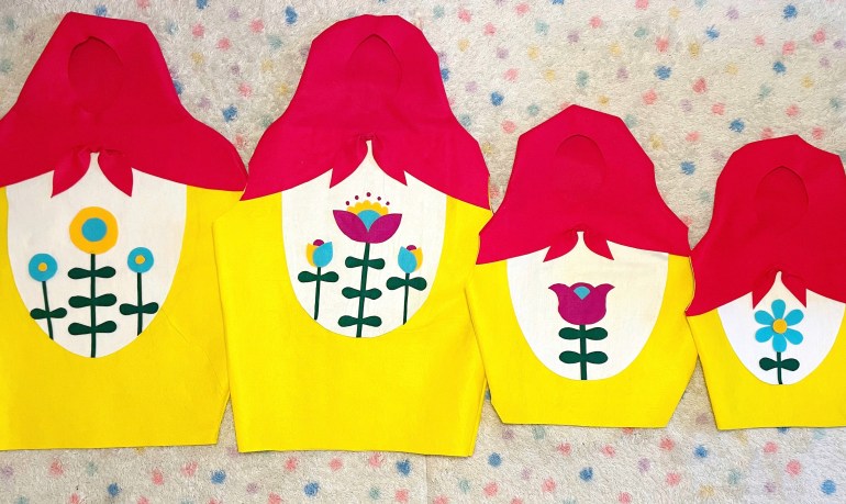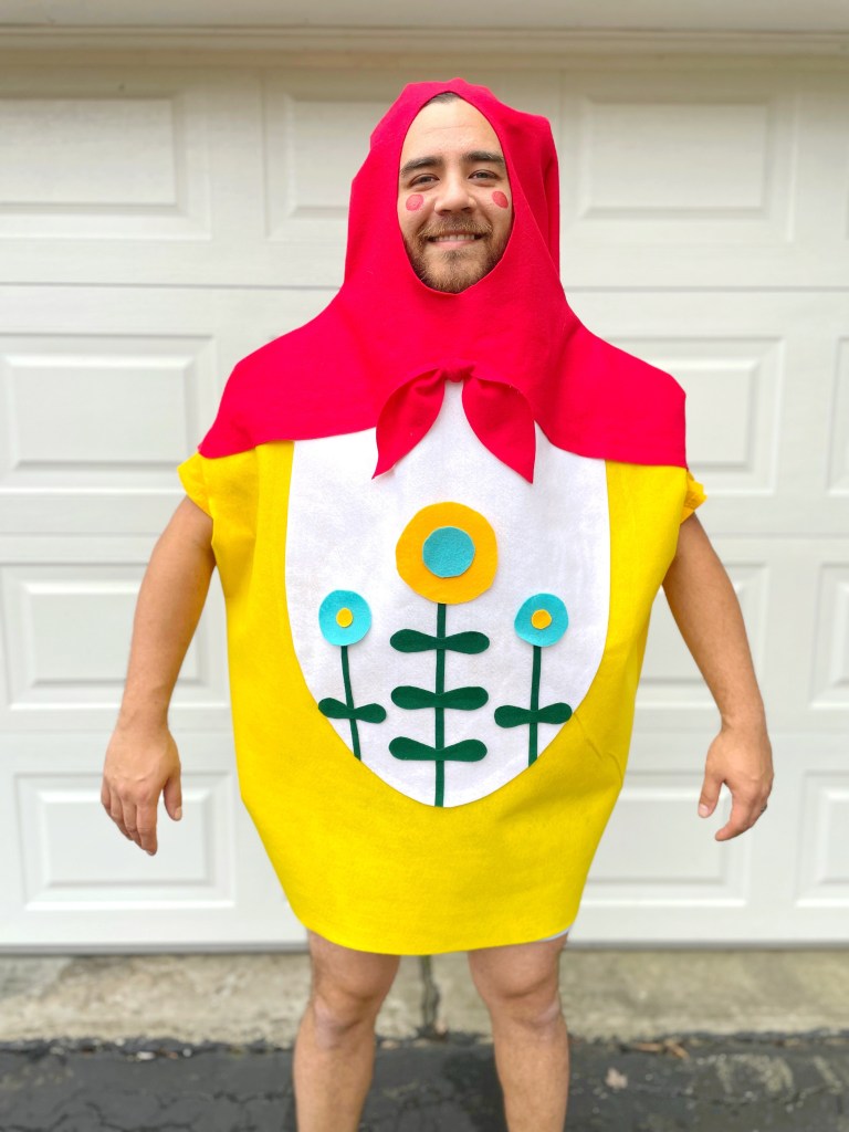 I chose to use felt for the entirety of each doll costume because 1.) I thought it’s rough texture would bond well with the fabric glue (which it did!) and 2.) I knew it was a stiff material and I thought it would hold it’s shape better than any other fabric I could have used (which is also true!) I went to my local Joann Fabrics and bought 3 yards of yellow and red felt and 2 yards of white. I had plenty of red and white left over after making all my cuts, but I used up almost every single bit of the yellow! As far as the floral designs, I used some scrap felt pieces I had left over from other projects!