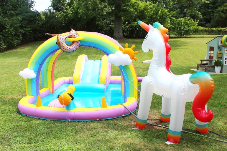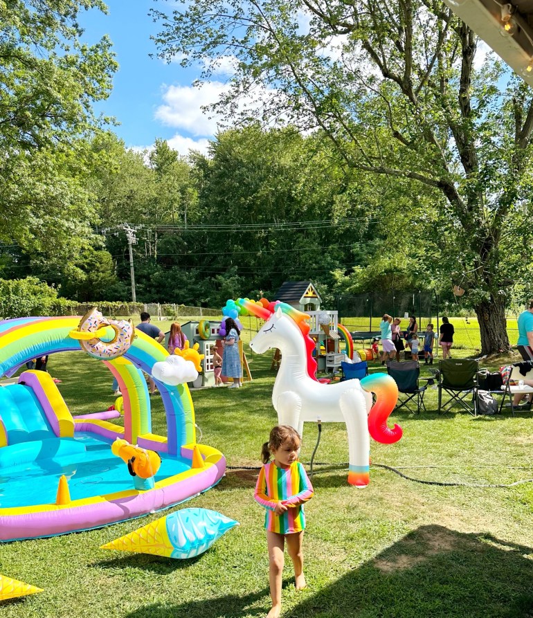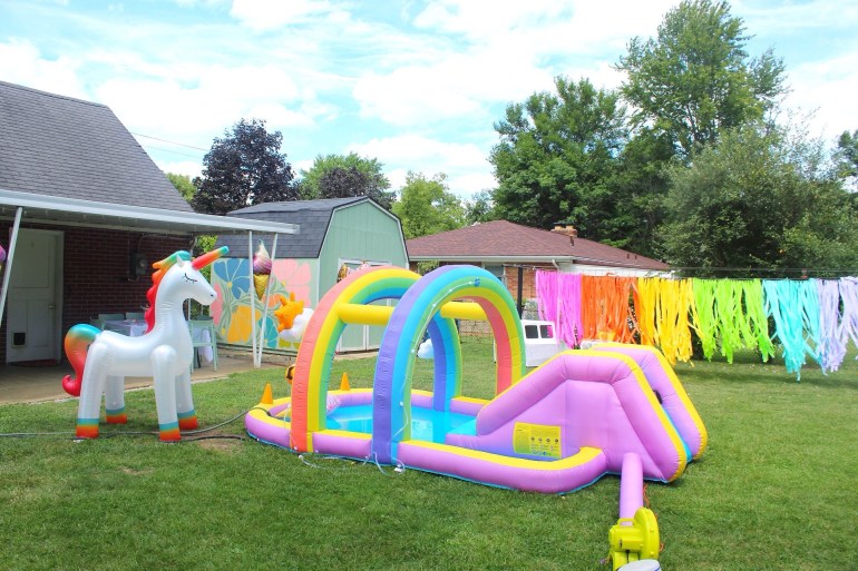 One of the gifts that my girls got for their birthday this year was this little inflatable water slide, so we knew we had to get it out for them and their friends to enjoy together! The unicorn sprinkler really didn’t fit the theme, but it’s a lot of fun, so we got that out too! haha