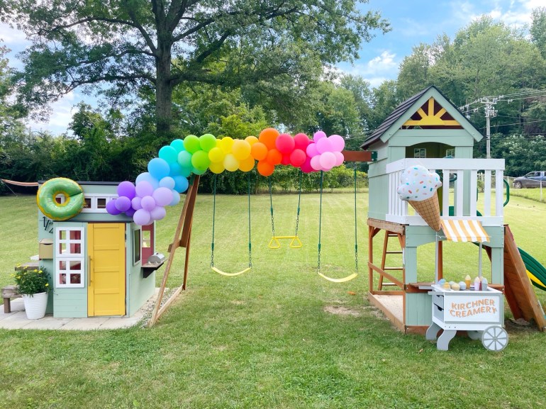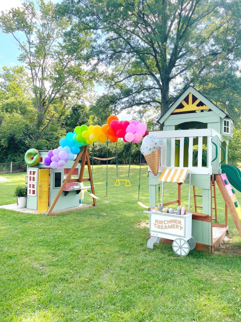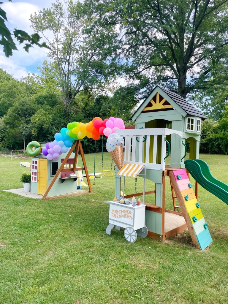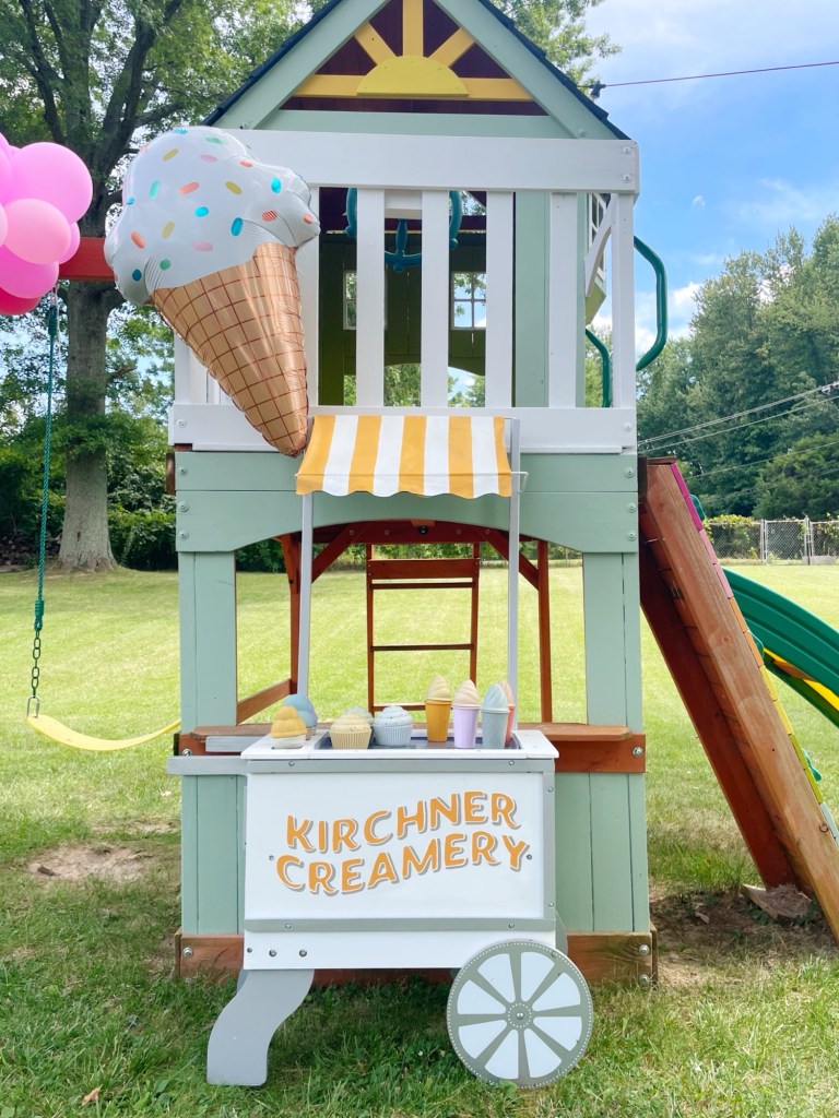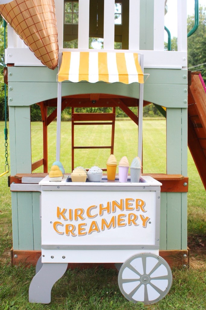 The girls got this ice cream cart a couple years ago as a Christmas present, but I decided to customize it for our family! Our last name is Kirchner, so I thought Kirchner Creamery would be a super cute name for our ice cream cart! I did not customize this cart with this party in mind, I already planned on painting it. But hey, since it matched, might as well use it for more decor!
