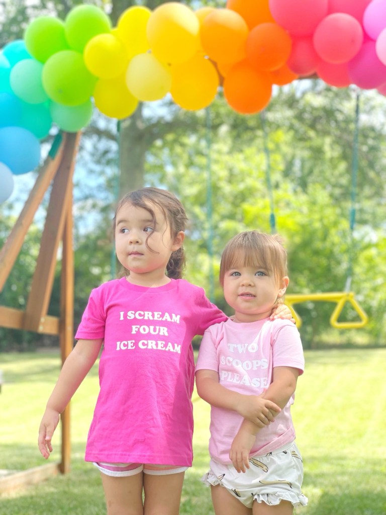 Luckily this theme lend itself to a lot of different sweet-based puns, so I had to roll with it! On my Cricut I made a shirt for Scarlett that said “I SCREAM FOUR ICE CREAM” and a shirt for Violett that said “TWO SCOOPS PLEASE”! But I couldn’t stop there, in true Kaitlin fashion, I had to make a themed top for everyone in the family! So I decided to make my husband a shirt that said “BEEF CAKE” and a shirt that said “SWEET CHEEKS” for myself!