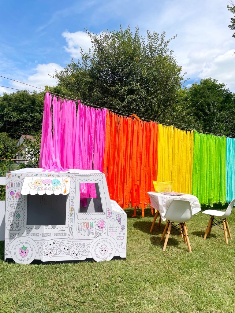 I found this adorable “create-your-own ice cream truck” at Target, and I thought it would be so fun for the kids to get to color and play in together! And then I also supplied some treat stickers that they could decorate all over the truck with as well!
