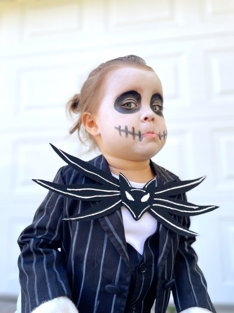 I was lucky enough to find a black suit at the thrift store, and just used a white paint marker to paint on the pinstripes! For the bat bowtie, I cut out the shapes from stiff black felt and then used white puff paint to paint on the details. I added some velcro to the back of the bowtie so that it was easy to place and remove from the shirt! I used white body paint for her face (looks a little more white in person than it does in pictures) but decided to put on white gloves for her hands. She is only a two year old, so I knew she would be handsy, and these gloves give the illusion without her spreading paint everywhere! haha Lastly, I used the black eyeliner marker to make the stitches around her mouth and circles around her eyes! It worked great, but was a PAIN to wash off!