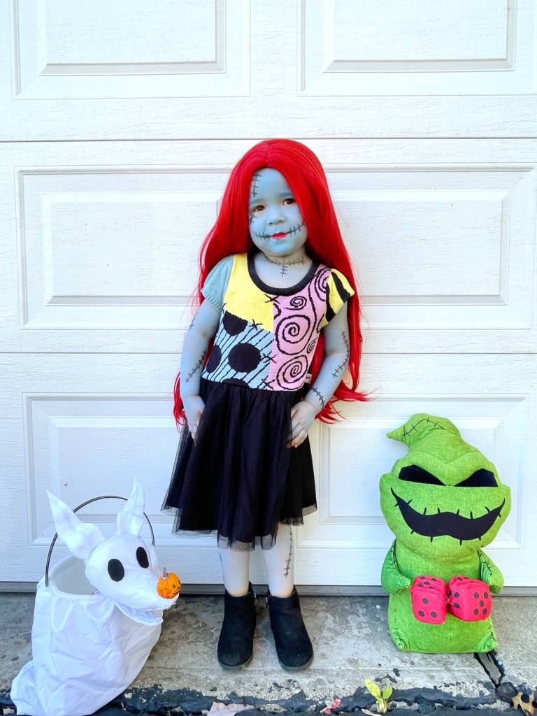 This Sally costume was also incredibly easy to pull off! I originally was going to DIY her dress, but we found this adorable tutu dress at Walmart and just went with that! The quality of the dress is great and it is perfect for my daughter to wear again and again! We also purchased the wig! I think a wig is a good Halloween investment and I figured we could use it for another costume in the future. The rest of the costume purely consists of body paint! We painted her face, arms, legs and chest blue, and then used the eyeliner to draw on the stitches! That’s it!
