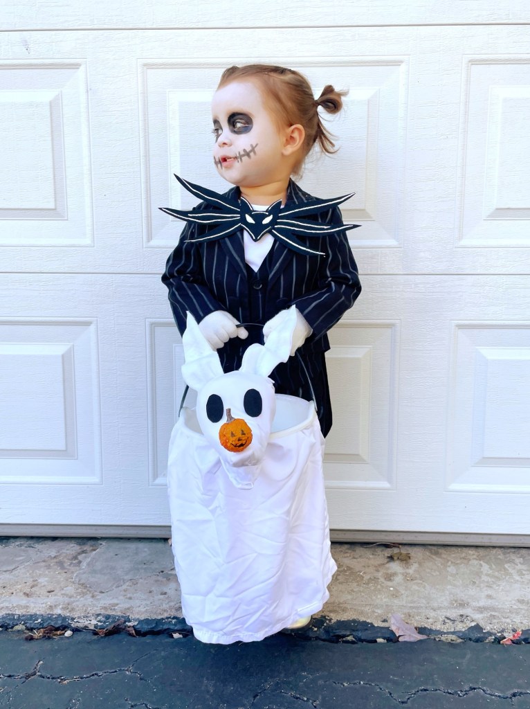 When creating this costume, I knew I couldn’t leave out Zero! In my heart, he is just as “main cast” as Jack and Sally! I originally thought about dressing up our family dog as Zero, but I thought a trick-or-treat bucket may be more useful!