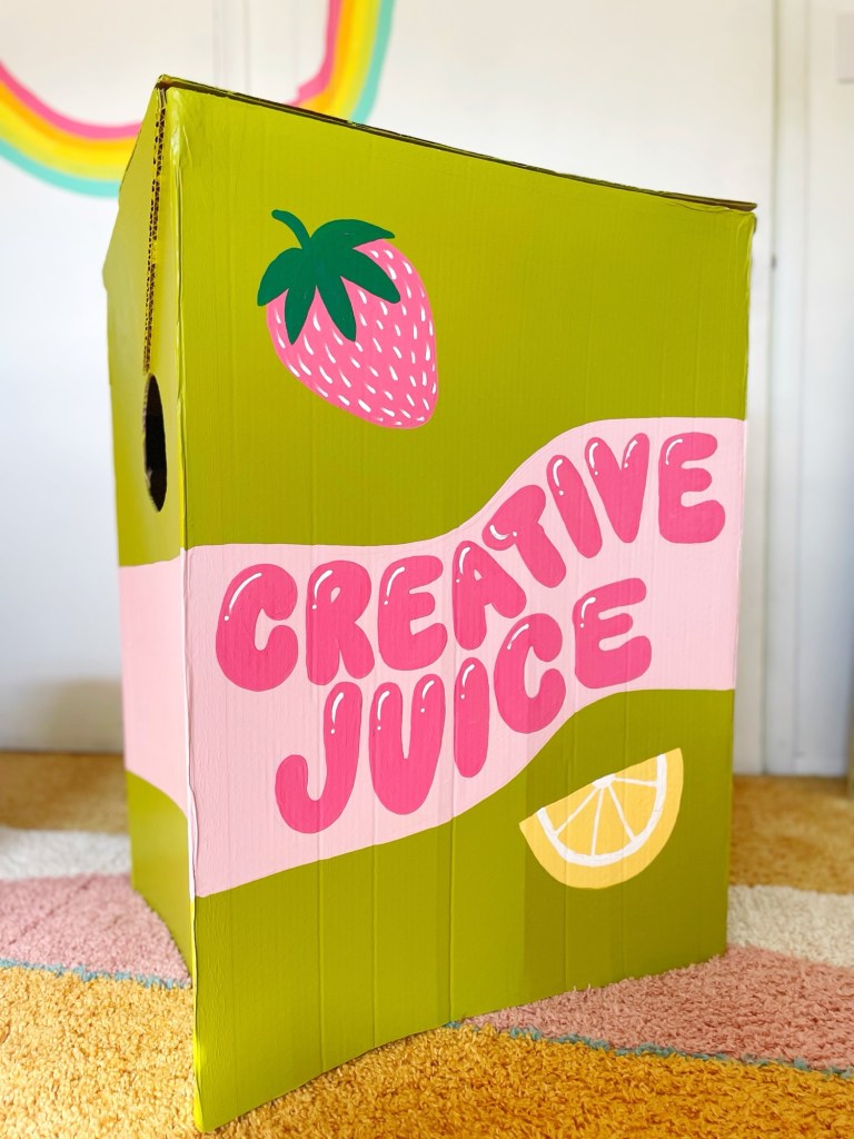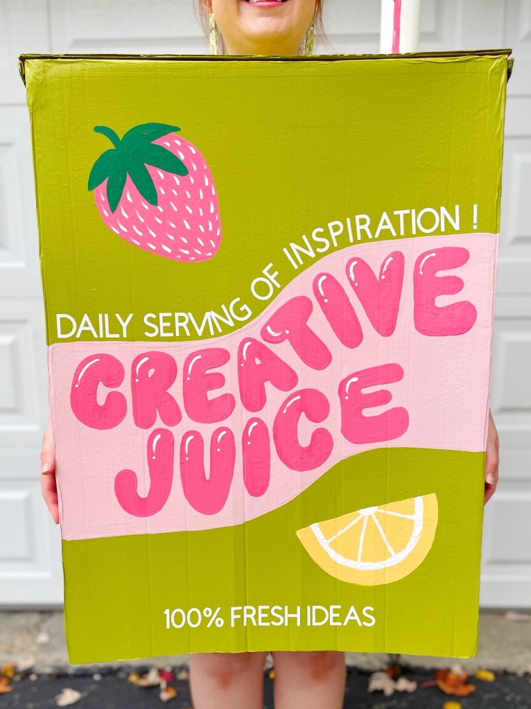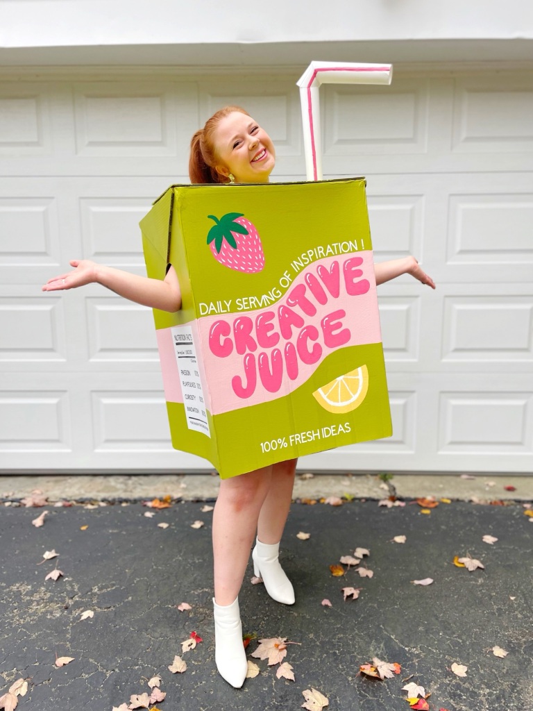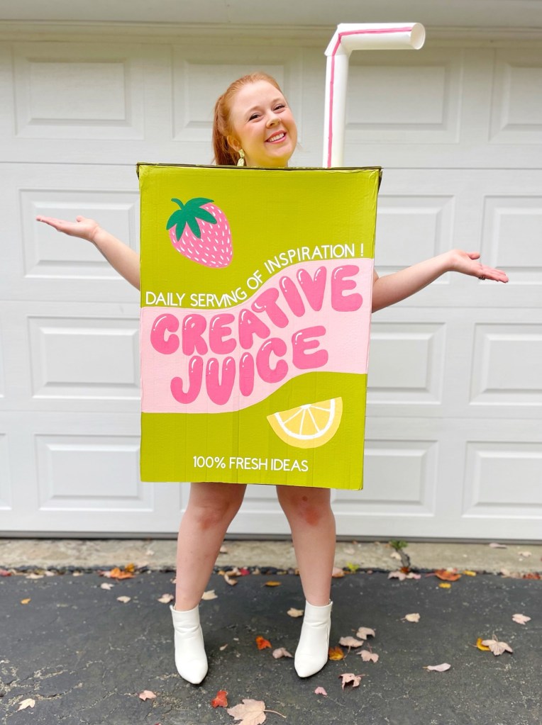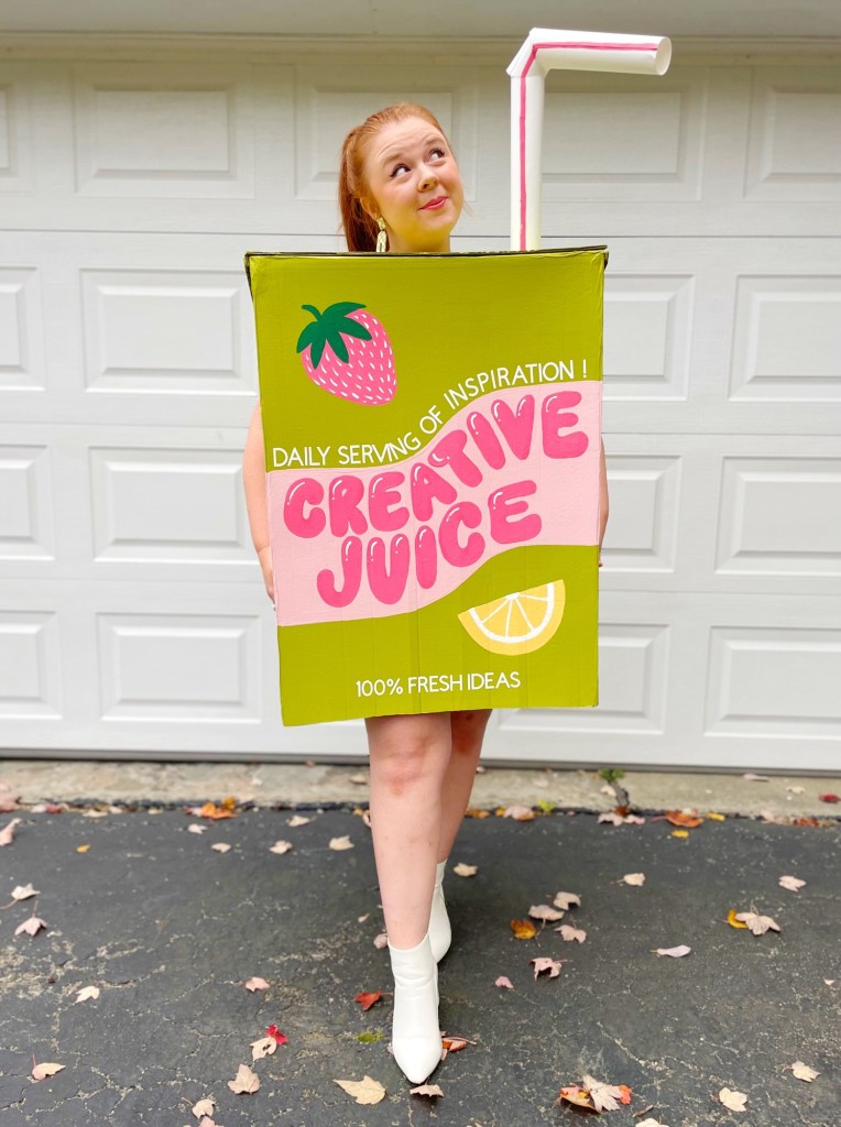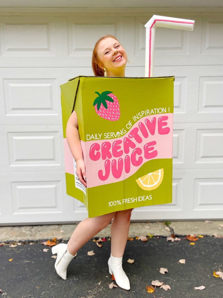 I don’t know about you, but I love a good pun! And creating a literal “creative juices” drink is the perfect pun for a costume! The funny thing is, this idea wasn’t originally meant for a costume. I actually had designed a tattoo for myself of a juice box that said “creative juice” on it a while back! I haven’t gotten the tattoo, nor do I have a plan to get that tattoo in the near future, but I designed it to get maybe one day! (I have lots of tattoo ideas) But when thinking up costumes for the year, the thought of that tattoo design popped into my head and I thought, well that would be fun to make as a costume! haha So I did!