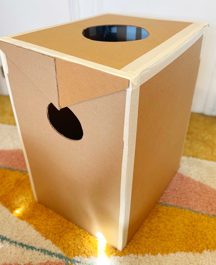 1.) First you will need a large cardboard box. (If you cannot find a box large enough, you can piece a box together from other boxes. That’s what I had to do!) Cut out a hole for your head at the top and both arms on each side. This is the basic construction of the entire costume, but if you would like to add more detail, you can add a little “folded over” cardboard piece to the sides and top. (see images above)