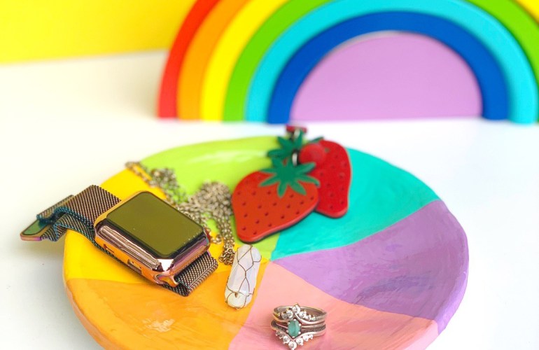 If you are anything like me, you probably end up leaving your stuff all over the house. Especially when you take off all your bulky accessories so you can relax for the day! Or if you are like my musician husband who is constantly leaving a trail of guitar picks everywhere he goes. Either way, it’s great to have a space for all those little things in your life that don’t seem to have a home anywhere else! And this catch-all dish is such a simple solution and an even simpler DIY!